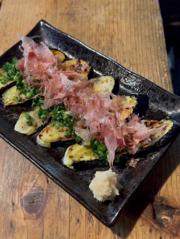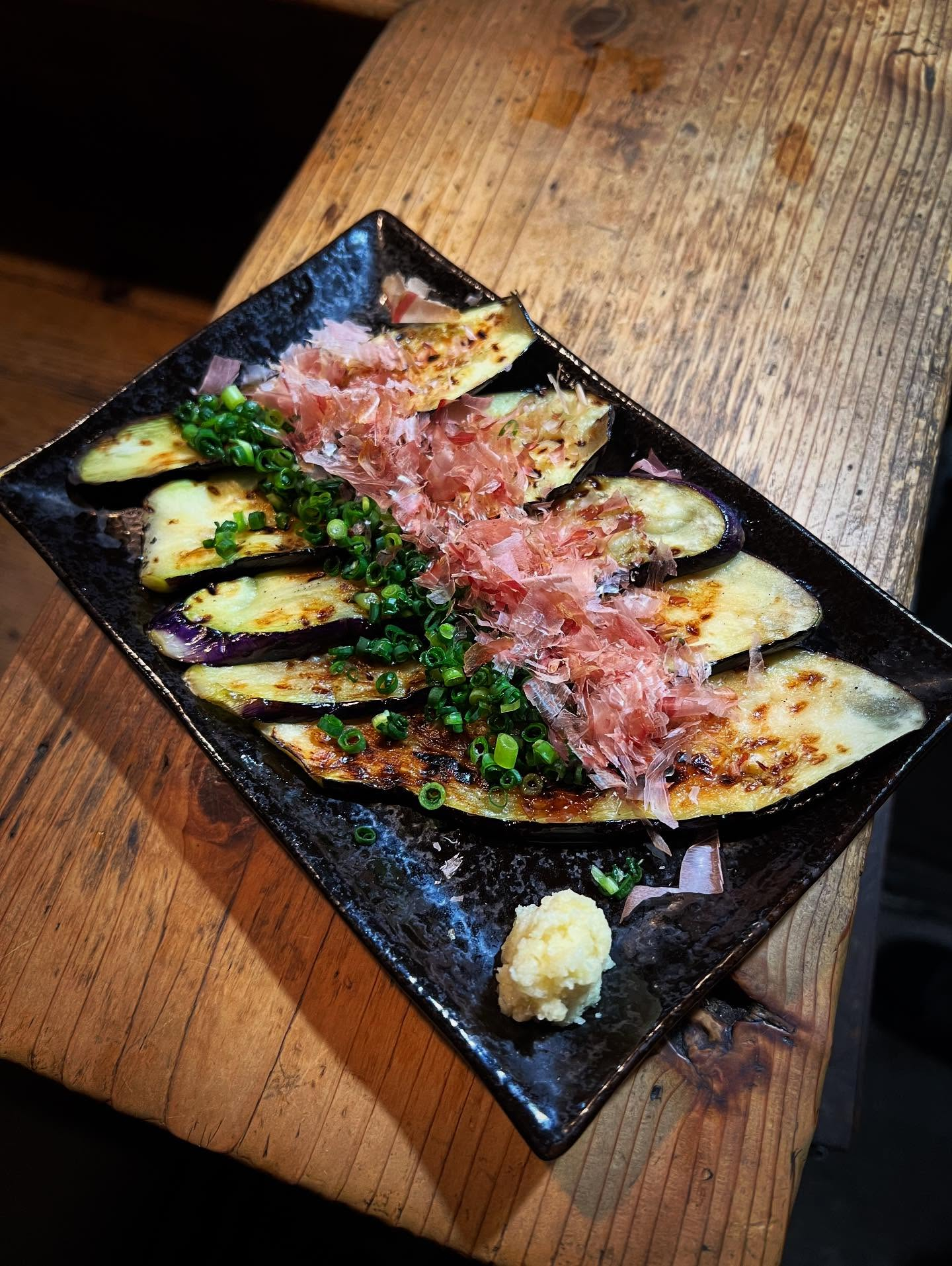 茄子の炭火焼き始めました‼️ ネギとかつお節を巻いてお酒のお供に是非